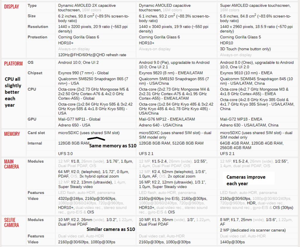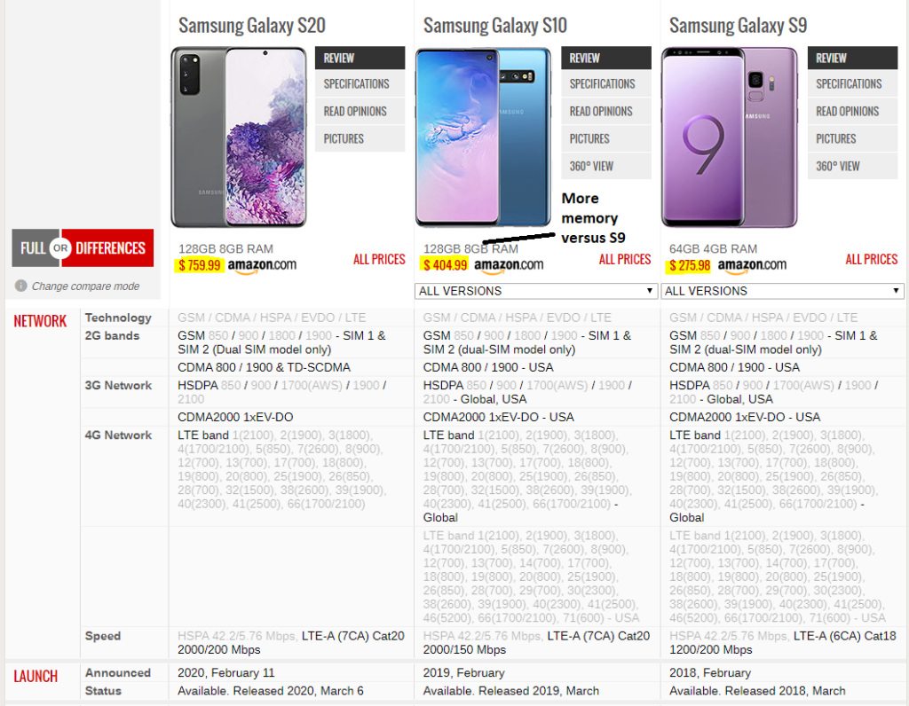 Therefore, unless your technology needs are significant, you will most likely be best served money-wise buying a new phone which is at least a year or two past its initial release. Moreover, the difference in performance between a phone one model year newer is likely insignificant versus the last model year. See below for a comparison provided by GSMArena.com of the Samsung Galaxy S20, S10, and S9 during the summer of 2020 with my annotations. The aspects of each phone which are the same year-to-year are grayed out.